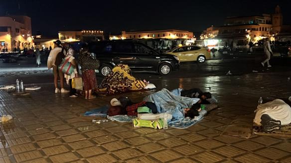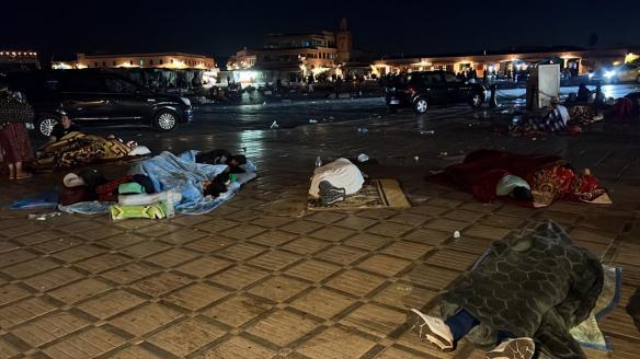 Por otro lado, un grupo de españoles de Elche ha dormido en el cemento de la plaza con otros españoles que han conocido en Marrakech, que fueron sorprendidos tomando el té en la azotea de su albergue. "De repente empezó a temblar todo y comenzó a salir humo del centro de Riad (hotel), así que nos tocó bajar corriendo. Entonces vimos una escena muy dura, con muchos edificios medio derrumbados y gente en el suelo que no sabías en qué estado estaba", expresa uno de ellos, Pablo Segarra, a EFE. Otra española, Margarita Pacheca, cuenta a la agencia que lo ha vivido como "una bomba": "Empezó a sonar un rugido y dije: 'es un atentado', duró como cuatro o cinco minutos, no he visto una casa parecida en mi vida, se nos ha caído la televisión, jarrones, espejos...."