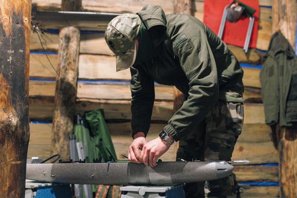 Un asesor del ministro ucraniano de Defensa enseña un dron de bolsillo que pesa menos de tres kilos y vuela hasta 64 kilómetros: lo están desarrollando en EEUU