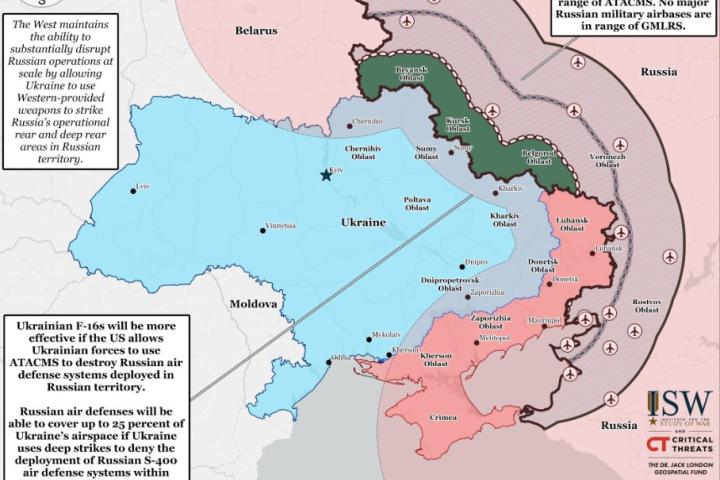 El mapa de ISW mostraba que Ucrania podría alcanzar objetivos rusos (incluidos el Óblast de Bryansk, el Óblast de Kursk y el Óblast de Belgorod) que podrían eliminar un máximo del 16% del santuario terrestre de Rusia. Sin embargo, dijo que no estaba claro si las fuerzas ucranianas tenían permiso para hacerlo. "Occidente mantiene la capacidad de perturbar sustancialmente las operaciones rusas a escala al permitir que Ucrania use armas proporcionadas por Occidente para atacar la retaguardia operativa y las áreas profundas de Rusia en territorio ruso", dijo IWS en su informe, de referencia desde el inici de la contienda, en 2022.