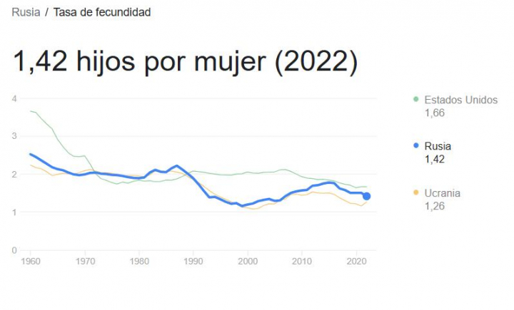 Esta cifra elevada de muertos ha provocado que la tasa de natalidad del país más extenso del mundo haya disminuido, con una media de 1,5 hijos por mujer, una cifra relativamente baja en comparación con la tasa que realmente necesita el país para mantener a su población, 2,1 hijos por mujer. Ante esta situación, el mandatario ruso, Vladímir Putin, ha impulsado una nueva medida que tiene como objetivo luchar contra la disminución de la tasa de natalidad del país- que de nuevo se situó en un nuevo mínimo de 25 años en septiembre- estableciendo un consejo para volver a tomar la política social de la "Década de la Infancia rusa" de 2017 para "proteger a los niños y a las familias".