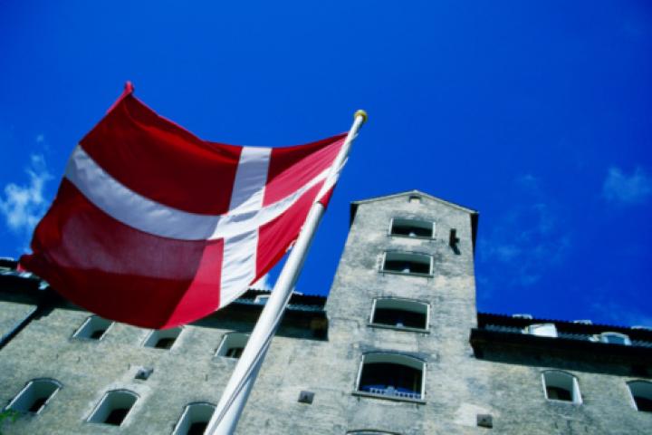 La bandera danesa delante del Hotel Admiral, Copenhague, Dinamarca, Europa.Getty Images