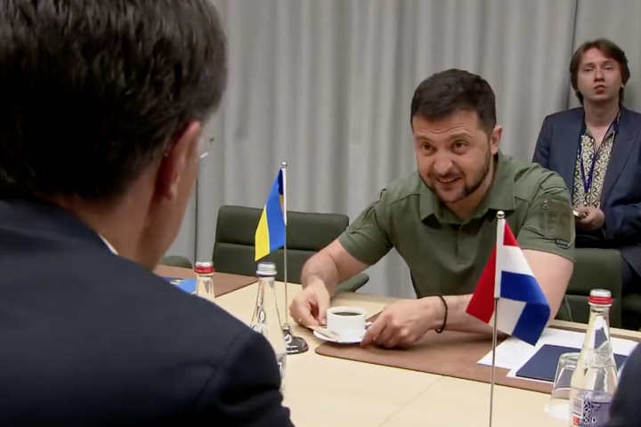 Pero es que hay otra imagen, mucho más amable, que refleja que el exactor y héroe por sorpresa de la invasión rusa de su país ha tenido que pelear mucho, hasta por el café. Como lo lees. La escena es la siguiente: Zelenski está sentado a una mesa frente a frente con su homólogo de Países Bajos, Mark Rutte, en una de las múltiples reuniones bilaterales que jalonan una cumbre de estas características en las que, además de estar presentes los 31 miembros de la OTAN, acuden otros aliados invitados. El caso es que Rutte se queda mirando el café que Zelenski tiene delante y, con tono un poco desesperado, le dice en inglés, que es el idioma común entre ambos: "¿Dónde has conseguido ese café?". El ucraniano, sorprendido, le pregunta a su vez: "¿Quieres? Toma el mío, toma el mío".