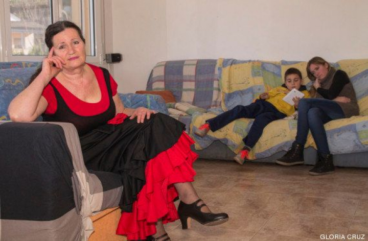 Quiero destacar que en las imágenes hay una voluntad expresa de luz, no existen sombras ni luces que den ni quiten protagonismos. Solo la puesta en escena nos puede sugerir quién tiene más o menos peso en ese hogar. Están realizadas en el salón de sus casas, sin ningún atrezzo, si acaso alguna petición que ellos me hacían y yo procuraba complacer, por ejemplo en uno de los casos, una protagonista me pidió salir retratada con su falda rociera mientras sonaba música de Camarón en una radio de pilas. Recordemos que ella hacía mes y medio que estaba sin luz eléctrica.