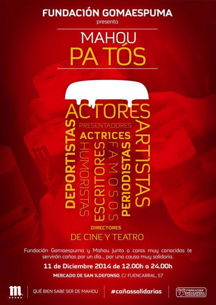 Este jueves 11 de diciembre, la Fundación Gomaespuma se pone un mandil junto a un montón de famosos y sirve cerveza fresquita en Madrid a todas las personas que quieran acercarse al Mercado de San Ildefonso de 12 a 24 horas. La iniciativa Cerveza Pa' Tós, que en esta ocasión se convierte en Mahou Pa' Tós, tiene como objetivo financiar proyectos de educación infantil en Nicaragua y Sri Lanka.