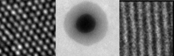Orden y simetría en el 'mundo nanoscópico', de izquierda a derecha: átomos de molibdeno en un cristal de una sal de azufre (magnificación de la imagen = un millón de veces). Nanopartícula de oro de unos 30 nm recubierta de agua. Sección de una nanotubo de carbono mostrando capas de grafeno (separación entre capas = 0.34 nm). Imágenes tomadas por GOG.