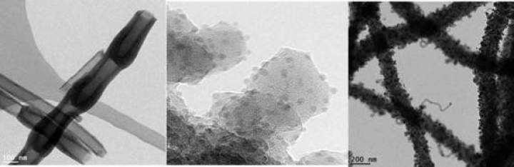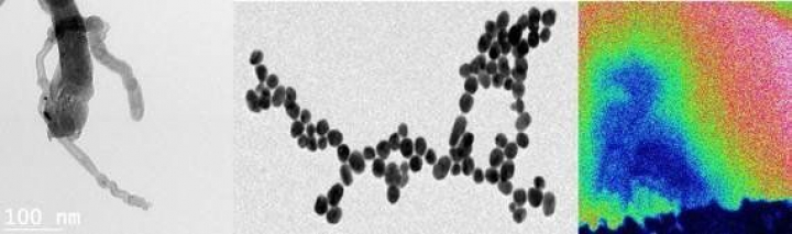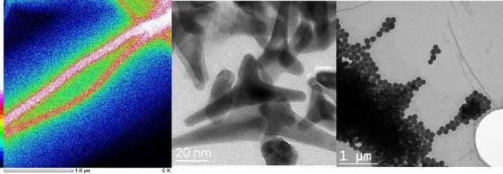 Guerra de las galaxias, de izquierda a derecha: mapa de composición química de nanotubos de carbono. Nanopartículas de oro con forma de nave espacial. Nanopartículas de sílica. Imágenes tomadas por GOG.