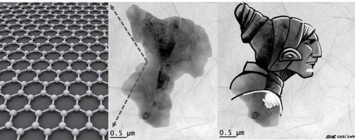 Ciencia y arte. Izquierda: representación gráfica del grafeno (fuente: Wikipedia). Centro: imagen de microscopía electrónica de una muestra obtenida al intentar producir grafeno (imagen, GOG). Derecha: la imagen del centro vista por Ignasi Cusí, ilustrador.