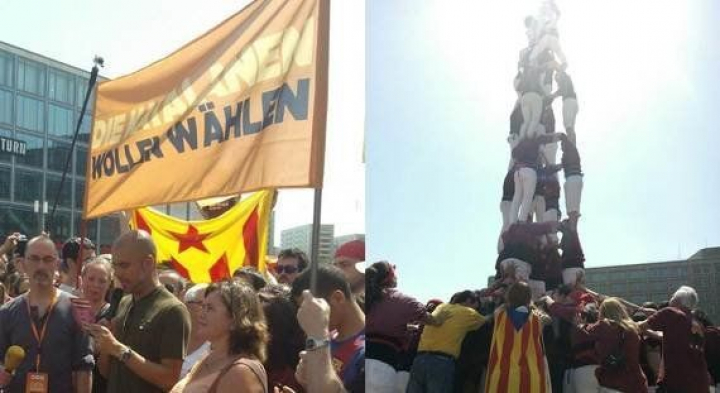 Pep Guardiola lee en Alexanderplatz, Berlín, un manifiesto en favor al derecho de poder decidir la independencia de Catalunya. En la parte derecha, el mismo día en el mismo lugar, a la misma hora, los castellers de Granollers levantan un castillo humano. Foto: GOG