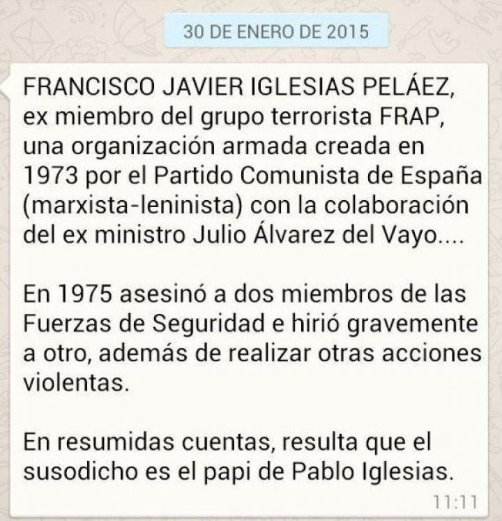No son sólo los medios de comunicación. Muchos ciudadanos, que democráticamente discrepan de los postulados de Podemos, se han sumado a la campaña del todo vale, sin darse cuenta de que un argumento bien armado contra la formación política -pueden encontrarse decenas sin necesidad de haber leído tratados de ciencia política- es mucho más convincente ante un discrepante que el ataque sin ton ni son. En esta absurda campaña se erige como muestra de la estupidez mayúscula un mensaje sobre el padre de Pablo Iglesias que circula por las redes sociales y Whatsapp. Este: