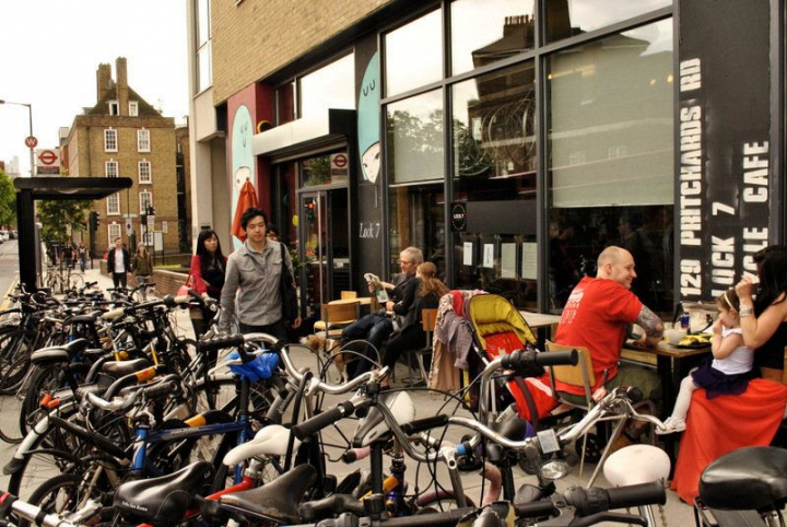 El café se llama Lock 7 Cycle Café y al llegar me encontré con unas 50 bicicletas aparcadas en la puerta, por lo que le pregunté al chico que estaba en la entrada y que trabajaba allí que si el café también ofrecían un servicio de alquiler de bicis... No sé si es que mi pregunta le pareció muy de corta, obvia o yo qué sé, pero con su acento british, sin mirarme a la cara y la bordería digna de un parisino se dignó a contestarme y me dijo que no, que eso eran bicicletas que habían sido reparadas y estaban esperando a que sus dueños las fuesen a recoger. Bastante impresionante teniendo en cuenta de que no hablamos de una tienda de bicicletas, sino de un café-taller.