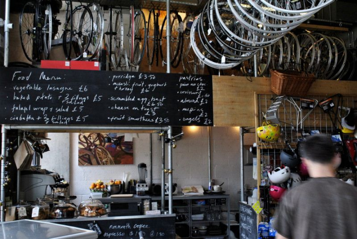 Y no es únicamente taller, sino también tienda de "complementos para la bici" venden cascos de todas las formas y colores, ruedas, los ya míticos asientos Brooks, candados o timbres... La verdad es que tenían de todo. Y también cafetería, claro. Con cafés a precios estándar londinenses (unas dos libras dependiendo del café), smoothies por 3,50, pasteles y bollería casera, lasaña vegetal, patata asada, wraps o sandwiches aptos para vegetarianos...