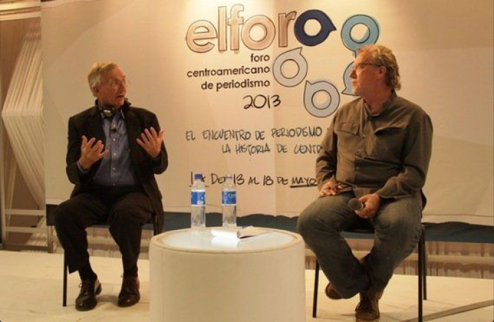 Seymour Hersh (izquierda) y Jon Lee Anderson charlan en mayo de 2013 durante la clausura del Foro Centroamericano de Periodismo organizado por elfaro.net. Foto: Mauro Arias.
