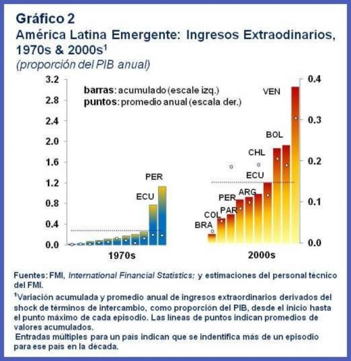 Dentro de la región, Bolivia, Chile y Venezuela se destacan por ser los que más se beneficiaron, con aumentos del 30% anual en Venezuela y del 20% en los otros dos países. También en el caso de esta medida, las cifras de América Latina son comparables solamente con las observadas en algunos países de Oriente Medio. Brasil está en el otro extremo de la distribución, con estimaciones de ingresos extraordinarios considerablemente más bajas, mientras que las variaciones de los términos de intercambio de México y Uruguay durante la última década, según nuestra definición, no califican como booms.