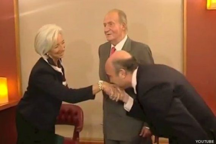 Esa misma mañana, nuestro Ministro de Economía recibía a la señora Lagar...de en la propia ciudad de Bilbao. Allí mismo, en un gesto de plasticidad cortesana inigualable, nuestro canciller económico emulaba la obra maestra del pintor sevillano. En un gesto de sumisión genuflexo, Luis de Guindos pareciera rendir la ciudad ante la directora del FMI. Ésta, benevolente, dedicaba a nuestro ministro su mejor sonrisa, mientras alargaba su brazo para que galantemente besara su mano. Eso sí, con los papeles cambiados: hoy es la centroeuropea la que recibe la sumisión española. Todo ello, con la presencia de su majestad hispánica al fondo del cuadro (muy pictórico aspecto), por si hacía falta más ambientación.