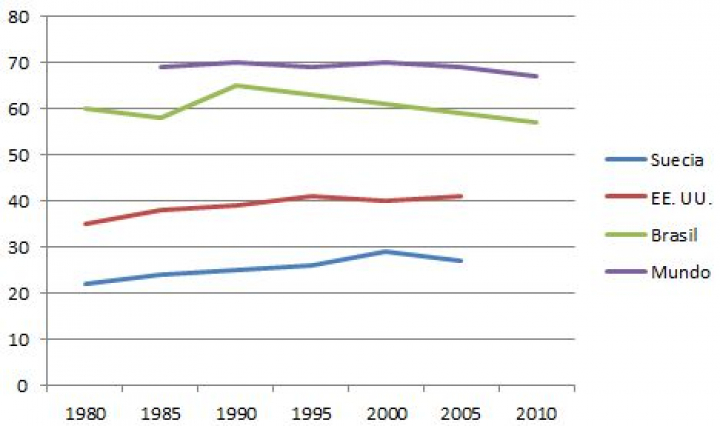 Evolución mundial del índice de Gini de 1980 a 2010. Fuente: Branko Milanović (Global inequality: A New Approach for the Age of Globalization).