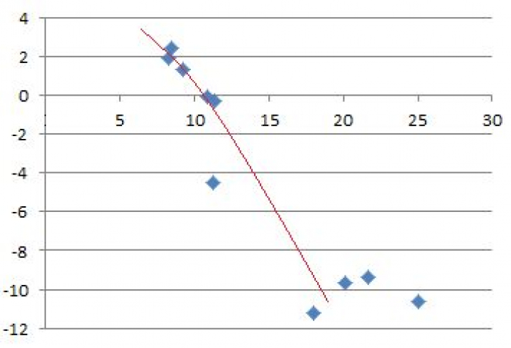 Las situaciones frágiles como la anterior son cóncavas. He recogido en Eurostat los datos de nuestro superávit presupuestario desde 2003 hasta 2012 (en ordenadas) con respecto a la tasa de paro (en abscisas), y podemos observar el gráfico siguiente.