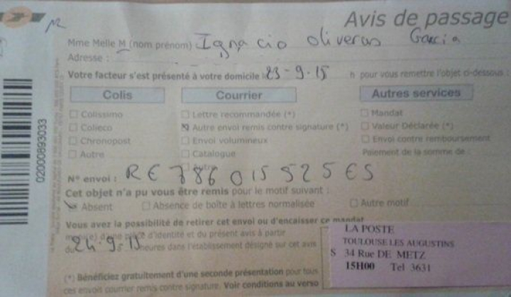 En estas elecciones, pese a lo anteriormente expuesto, he logrado rogar a la autoridad competente que me conceda el derecho al voto. Pues bien, una vez rogado el voto, el proceso se repite de nuevo para votar. En mi caso, apriétense los machos, las papeletas me llegaron el 23 de septiembre, cuando el plazo para votar por correo se cerraba el 22. Como el 23 no estaba en casa cuando pasó el cartero a dejarlas (da la casualidad de que trabajo), y puesto que me llegaron por correo certificado, las papeletas volvieron a la oficina de correos, donde debía recogerlas el jueves 24.