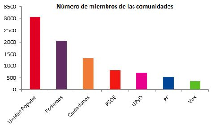Queremos sin embargo enfatizar que el tamaño relativo de estas comunidades políticas no se relaciona con los votos finalmente recibidos por tales formaciones. Y ello seguramente porque, en su conjunto, el usuario tipo de Twitter es más joven, con un nivel socioeconómico más elevado y mayor interés en la política, así como mayor presencia en áreas urbanas que el ciudadano medio. Un perfil sociodemográfico que se corresponde precisamente con una parte importante de votantes de las nuevas opciones políticas (Podemos, Ciudadanos), así como de Unidad Popular, pero que deja fuera una gran parte de los votantes de los partidos tradicionales.