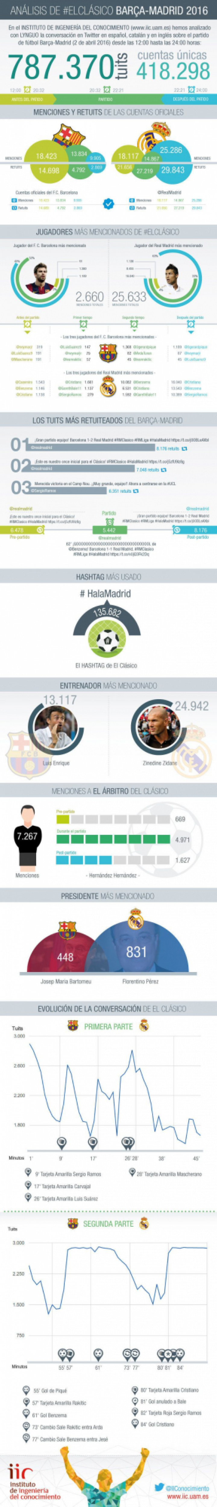 Como podéis ver en la infografía sobre El Clásico, el Real Madrid lideró la conversación: se registraron más menciones de la cuenta oficial y más retuits. Entre otros datos curiosos, el presidente del Real Madrid, Florentino Pérez, recibió casi el doble de menciones que Josep Maria Bartomeu, presidente del Fútbol Club Barcelona; y el jugador más mencionado del Madrid, Cristiano Ronaldo, recibió aproximadamente 10 veces más menciones que el jugador más mencionado del Barcelona, Piqué.