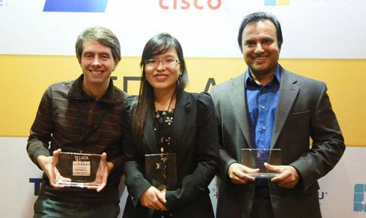 Los ganadores del TEXATA 2015, de izquierda a derecha: Álvaro Barbero (segundo), Kristin Nguyen (ganadora), Sri Kanajan (tercero) | Fuente: Big Data Analytics World Championships 2015 (TEXATA).