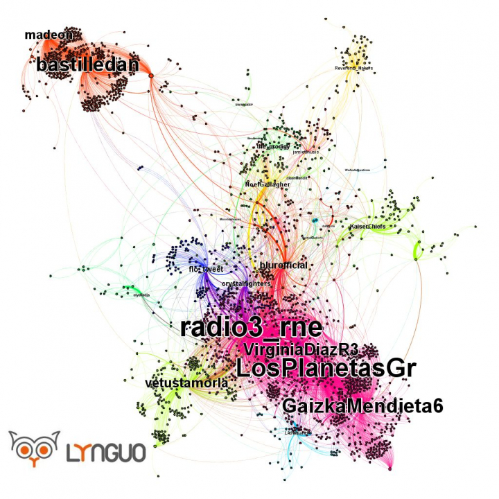 Finalmente, es destacable la cobertura que hizo del evento Radio3, cuya posición central en el grafo muestra un trato proporcionado a todos los grupos (haciendo de puente entre escena nacional e internacional). Y por último, como anécdota del festival, la hazaña del exfutbolista Gaizka Mendieta tuvo mucho eco en la red, a la vista de la buena interpretación que hizo junto a Los Planetas del tema Un buen día.