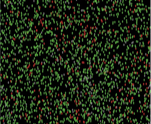 Una pequeña población de 5000 habitantes se enfrenta a una enfermedad altamente contagiosa y mortal. Se han simulado diferentes escenarios empleando NetLogo, de manera que en cada simulación se considera un porcentaje distinto de la población vacunada. En la siguiente imagen podemos ver el estado de dos simulaciones 25 días después del inicio de los primeros contagios.