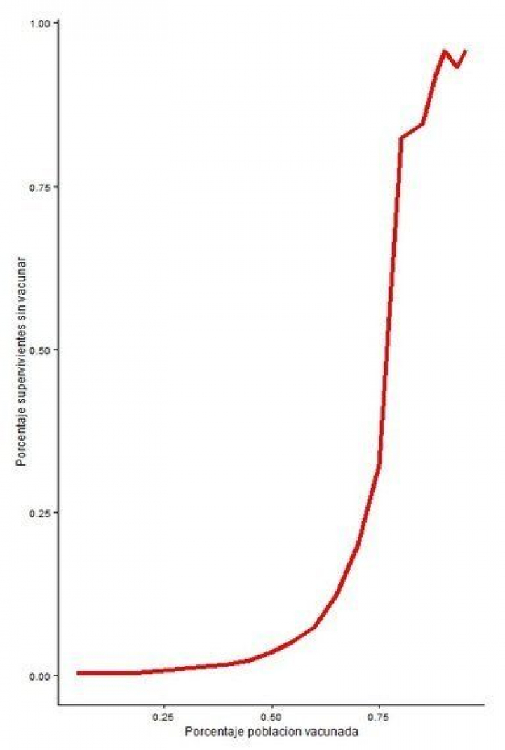 En la gráfica siguiente, se muestra cómo varía el porcentaje de personas no vacunadas que sobrevive a la epidemia en función de la proporción inicial de personas con vacuna. Cuando la población vacunada es superior al 85%, las personas sin vacunar están relativamente protegidas, sobreviviendo a la epidemia más del 90%. En cambio, cuando la proporción inicial de población vacunada está solo en torno al 80%-85%, empieza una caída dramática en el número de supervivientes no vacunados. Así, con un 70% de vacunados inicialmente, solo sobrevive el 20% de los no vacunados, y para un 20%, el porcentaje de supervivientes cae hasta el 4%.