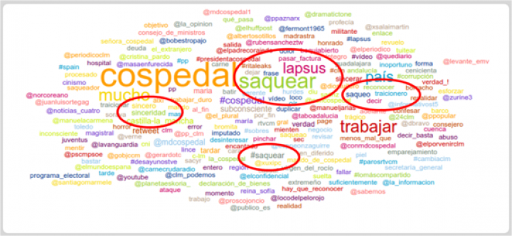 Cuando esto sucede, la forma más rápida de saber lo que está ocurriendo es acudir a las palabras más representativas en forma de nube de ideas, donde nos encontramos: saquear (29.154 apariciones), lapsus (16.515), saqueo (1.424), sinceridad (1.725), sincero (1.094) y otras como error, subconsciente, traicionero o traicionar. "Hemos trabajado mucho para saquear a nuestro país" es el lapsus que las redes sociales no perdonaron a María Dolores de Cospedal.