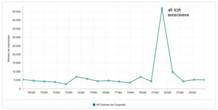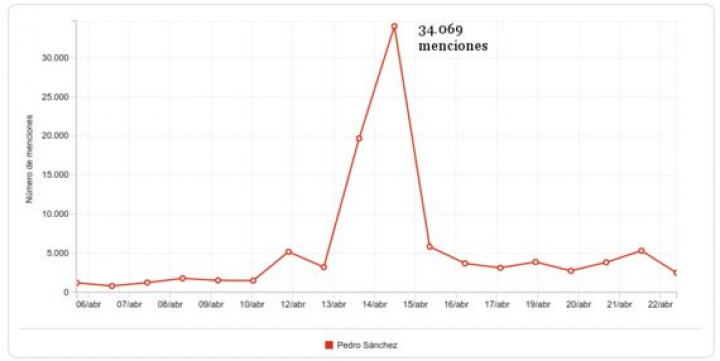 Sin embargo, Cospedal no fue la única. Pocos días antes, el 15 de abril, también Pedro Sánchez experimentaba un pico de presencia superior al habitual que pasaba de las 30.000 apariciones en redes sociales.