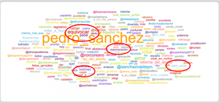El secretario general del PSOE había votado por error a favor de la reforma de la ley del aborto planteada por el PP, y en este caso la nube de ideas hablaba de votar (9.428 apariciones), error (4.213) o aborto (967), pero también en otro tono de dedo, botones, botón azul, botón rojo, liarla parda.