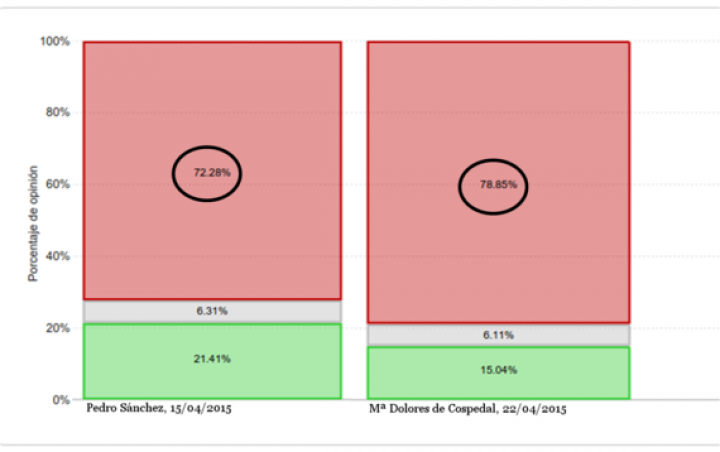 Podemos hacernos varias preguntas, poniéndonos serios: ¿cómo de caros se pagan los patinazos? ¿Qué impacto tienen en la opinión de los usuarios de redes sociales y en la imagen del político? ¿Cuánto dura la resaca de una metedura de pata? En la siguiente imagen podemos ver el porcentaje de opinión negativa, en rojo, para Pedro Sánchez el 15 de abril y para Mª Dolores de Cospedal el 22 de abril, ambos por encima del 70%.