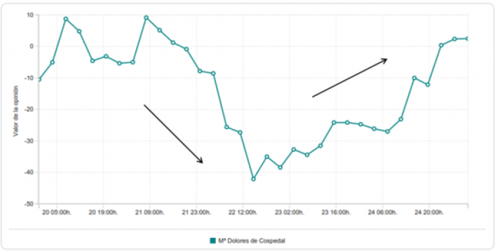 De modo que, en términos absolutos de opinión, tener un lapsus sale muy caro. Pero, ¿cuánto hay que esperar para que se olvide en las redes? Lo que observamos a continuación es la evolución de la opinión sobre Mª Dolores de Cospedal en el tiempo, desde unos días antes hasta unos días después de sus declaraciones.