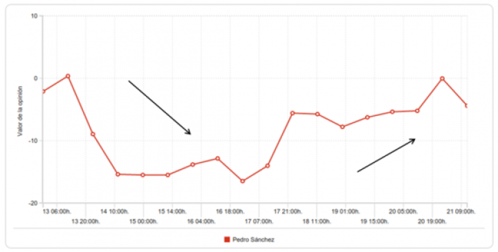 Del mismo modo, podemos ver la evolución temporal de la opinión sobre Pedro Sánchez, desde dos días antes de su voto por error hasta seis días después.
