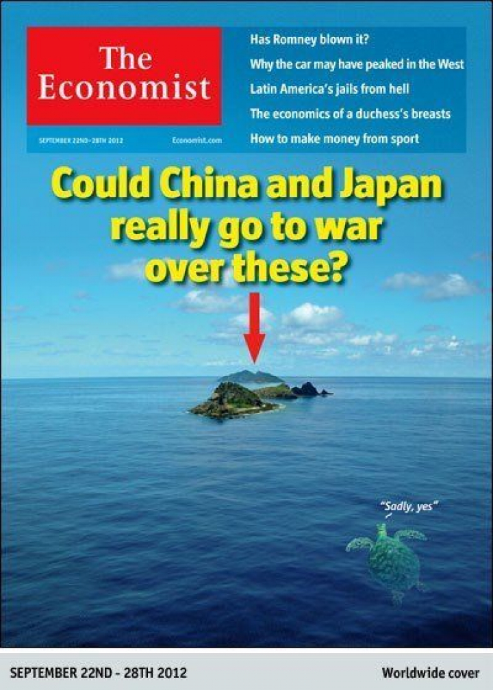 La tensión entre China y Japón se ha disparado desde que comenté sus querellas históricas hace una semana. La compra de tres de las cinco islas del archipiélago Senkaku/Diaoyu por parte de Tokio desembocó en las protestas de ciudadanos chinos que han recogido ampliamente los medios de comunicación de todo el mundo. Se habla de alta tensión entre ambos países, pero, ¿realmente puede estallar una guerra entre la segunda y la tercera economías del mundo? Este temor comienza a tener cabida en la prensa internacional como indica el tema la portada de The Economist.