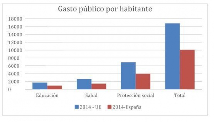 Observemos ciertas propuestas de alguno de los partidos que se presentan el 26J con respecto a ingresos y gasto público. Concretamente, el PP propone reducir el ratio gasto/PIB en el Plan de Estabilidad presentado a Bruselas y C's reducir "grasa política". Este argumento lleva implícito que el sector público español es ineficiente, gasta más de lo necesario y esto provoca la aparición de déficit público. El problema es que ningún indicador del tamaño del sector público apunta en dicha dirección, ni muestran un gasto público excesivo, sino todo lo contrario. Concretamente, España ocupa el puesto 20 -de 28- con respecto al porcentaje de gasto público sobre el PIB, con un 43,3% frente a un 48,6% de la eurozona en 2015 (47,4 la UE 28). Es más, si observamos el gasto por habitante podemos observar que España tiene un menor gasto por habitante en salud, educación, o servicios sociales (aunque superior en orden público, o policía, eso sí).