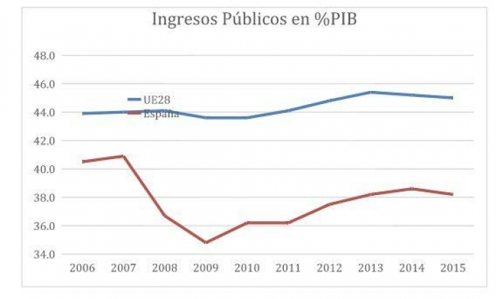 Sin embargo, y a pesar de que los ministros Montoro y De Guindos siempre hacen referencia únicamente a problemas de gastos cuando se habla de déficit, el verdadero problema de la estabilidad presupuestaria de nuestro país reside en la debilidad de nuestros ingresos. Como pone de manifiesto Eurostat, el peso de los ingresos en nuestro país sobre el PIB es de un 38,2%, muy por debajo de la media de la Unión Europea, que fue en 2015 del 46,6% (España ocupa concretamente el puesto 23 de 28). Es cierto que la crisis ha mermado los ingresos públicos, pero el caso de España es excepcional, pues en ningún país de la zona euro han caído de manera tan pronunciada. Y lo peor es que ni con el crecimiento económico experimentado durante el último año éstos han sido capaces, ocho años después, de recuperar los niveles previos a la crisis.