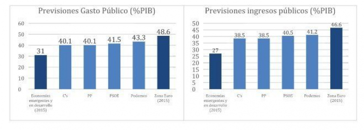 El programa de Podemos presenta una propuesta que permite, por el lado del gasto, no alejarnos de más de la UE, y por el lado de los ingresos, recortar al menos en tres puntos porcentuales la diferencia con Europa. También propone mantener -no incrementar- el ratio de gasto público sobre el PIB de 2015 -40,3%- para no seguir alejándonos de Europa.