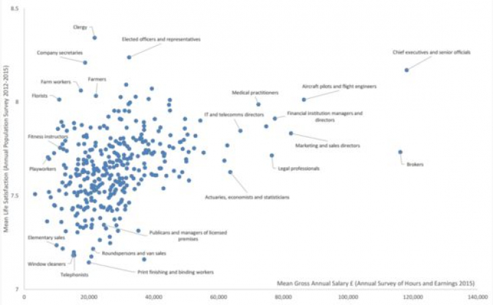 El nivel de satisfacción en la vida depende hasta cierto punto del sueldo, pero va dependiendo menos a medida que el sueldo aumenta. En el gráfico de abajo, se mide la satisfacción media en el eje vertical y el sueldo en el horizontal. La satisfacción aumenta a medida que se gana más dinero. Pero eso no lo es todo. Los corredores de bolsa, que ganan de media unas 120.000 libras al año (unos 144.000 euros), están en la media en cuanto a nivel de satisfacción. Por otro lado, los miembros del clero, que cobran una media de 20.000 libras (unos 24.000 euros) al año, están tremendamente satisfechos con su trabajo (aunque en su trabajo se les proporciona alojamiento, así que quizá este sueldo sea artificialmente bajo). Igual ocurre en el caso de los dirigentes y los representantes electos.