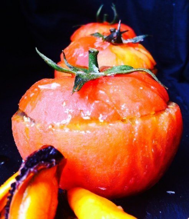 - Emplatado: servir en cada plato un tomate con la tapa puesta, pintar con un pincel con aceite y espolvorear unas escamas de sal.