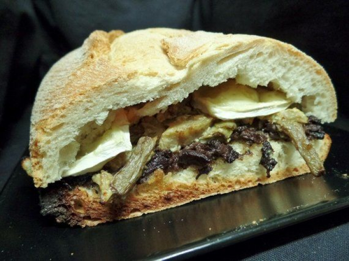 - Abre el pan por la mitad. Si tiene mucha molla quítale un poco para que luego asiente bien al cerrarlo. Extiende el revuelto de alcachofa en el pan. Sobre el mismo, cubriéndolo todo, la morcilla deshecha y cubre con láminas de queso Brie. Introducir al horno y gratinar.