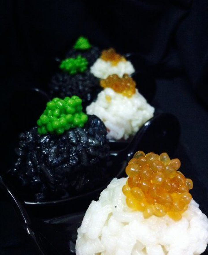 - Emplatado: coloca las bolas alternándolas y corónalas con unas perlas de soja las primeras y de wasabi las segundas.