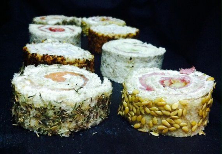 - Pasado ese tiempo, quitamos el film y, con una brocha, humedecemos un poquito con aceite o mantequilla líquida cada rulo. El de salmón lo pasamos por eneldo picado en todo su contorno, el de cabeza de jabalí por semillas de sésamo y el de jamón en romero o tomillo. Cortamos en rodajas de 1 ½ -2cm de grosor y servimos.