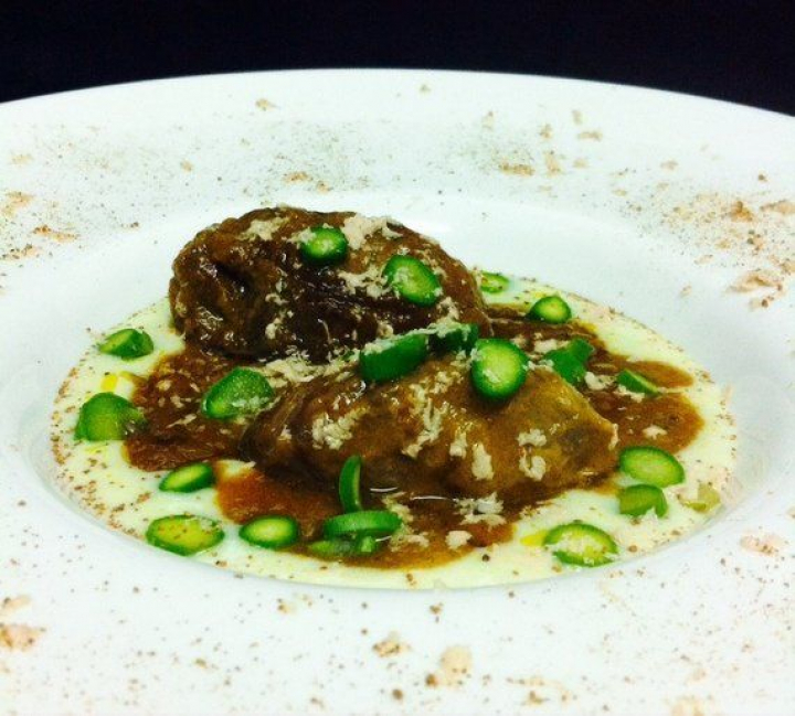 - Emplatado: en un plato hondo, coloca 4 cucharadas de puré, sobre el mismo 2 cucharadas de salsa y en el medio 2 carrilladas. Esparce por encima trocitos de espárragos y ralla sobre el conjunto virutas de mousse.