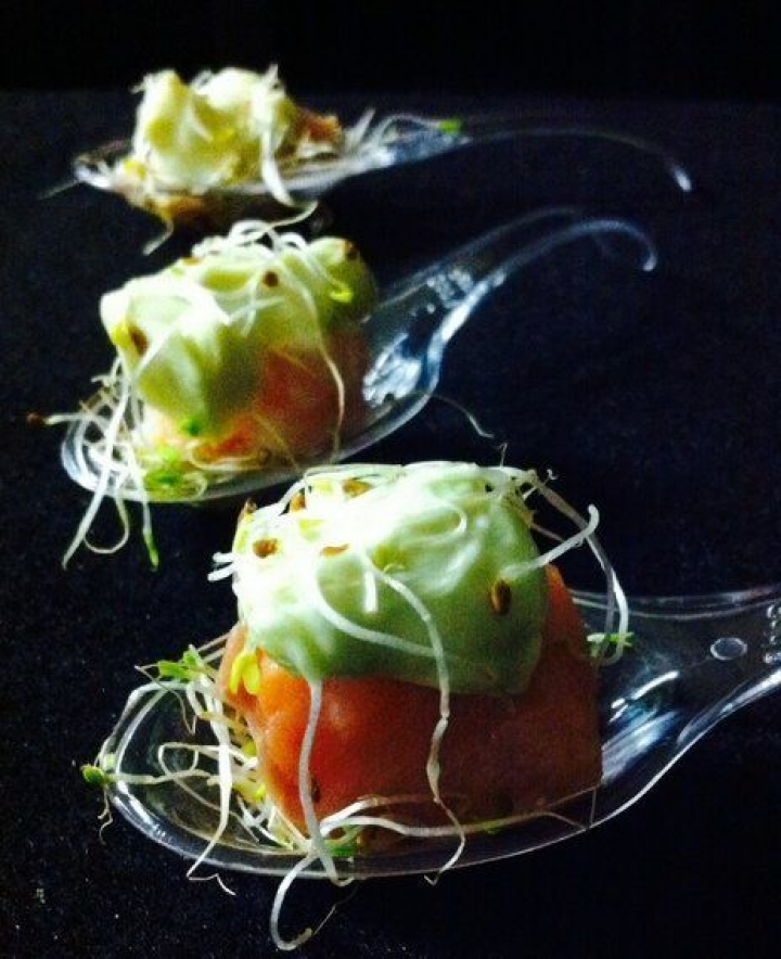- Emplatado: sobre cucharillas de servicio colocar un pequeño taco de salmón, sobre él una cucharadita de mayonesa de wasabi y culminar con unos brotes de alfalfa.
