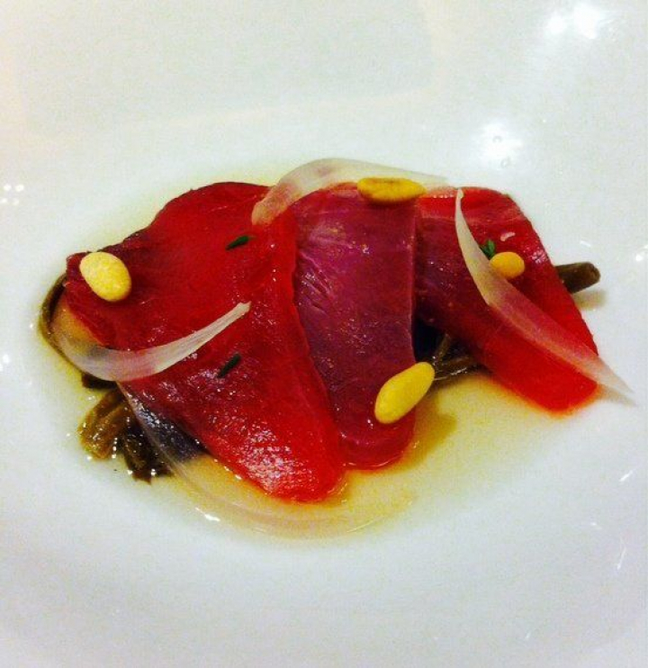 - Emplatado: seleccionamos unas cuantas setas de las utilizadas en la infusión y las ponemos en el centro de un plato hondo, añadimos un cacito de la infusión, colocamos encima el carpaccio de atún y decoramos con unas plumas de cebolleta, piñones y un poquito de romero fresco picado. Servir tibio.