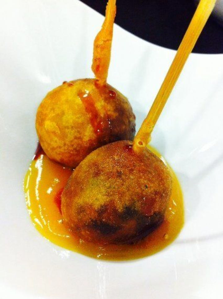 - Emplatado: en un plato hondo vierte una cucharada de crema de calabaza y sobre la misma dispón 2 ó 3 buñuelos de morcilla. Añade por encima un hilillo de miel de caña.