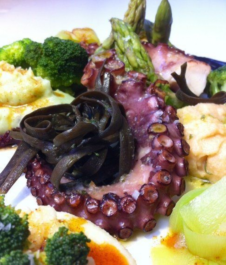 Si no los encuentras (se vende en herbolarios) o lo deseas, prescinde de los espaguetis de mar y crea tu fondo marino con las verduras que quieras o donde la imaginación te lleve, aunque como te decía le da un toque de sabor muy interesante. Del mismo modo, la vinagreta es opcional y puedes acompañar el conjunto, y sobre todo el pulpo, con aceite y pimentón, aunque te aseguro que ésta le da un toque al pulpo que te sorprenderá. Como te habrá sobrado, con patatas o pechuga a la plancha está deliciosa.