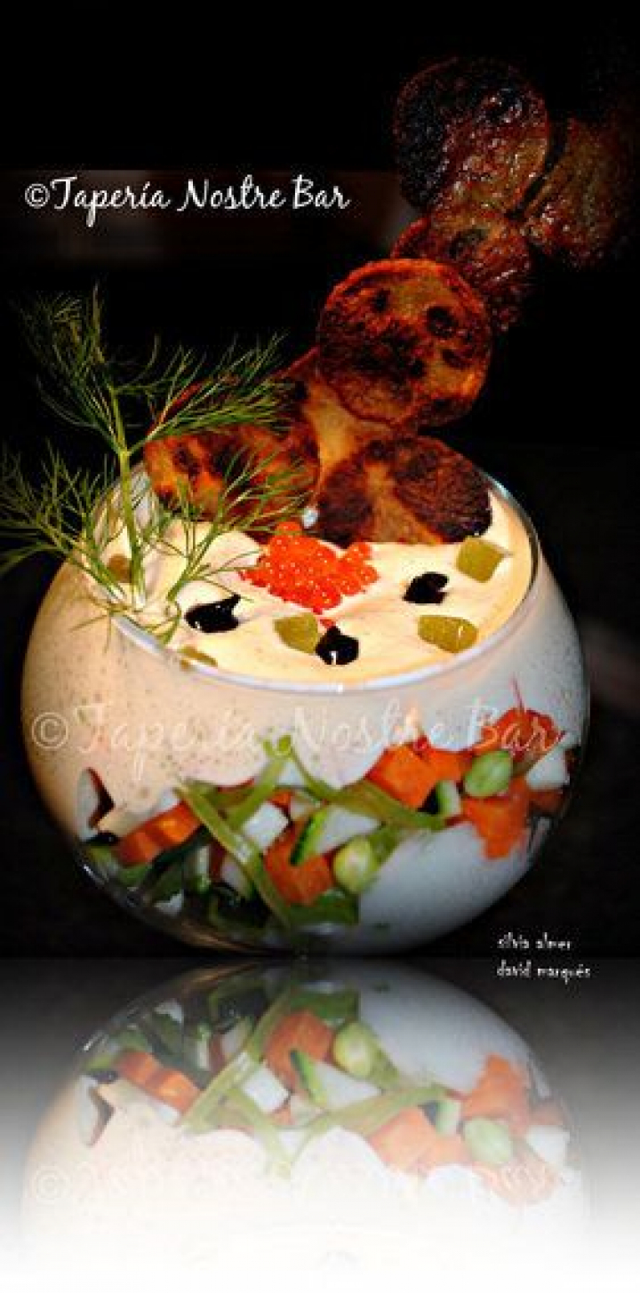 El montaje de esta receta requiere obligadamente de un recipiente transparente para que el resultado sea tan espectacular como el plato en sí. Por supuesto, para ajustarlo a unos bolsillos modestos acordes con los tiempos, el sucedáneo de caviar, rojo o negro, será la opción más acertada.