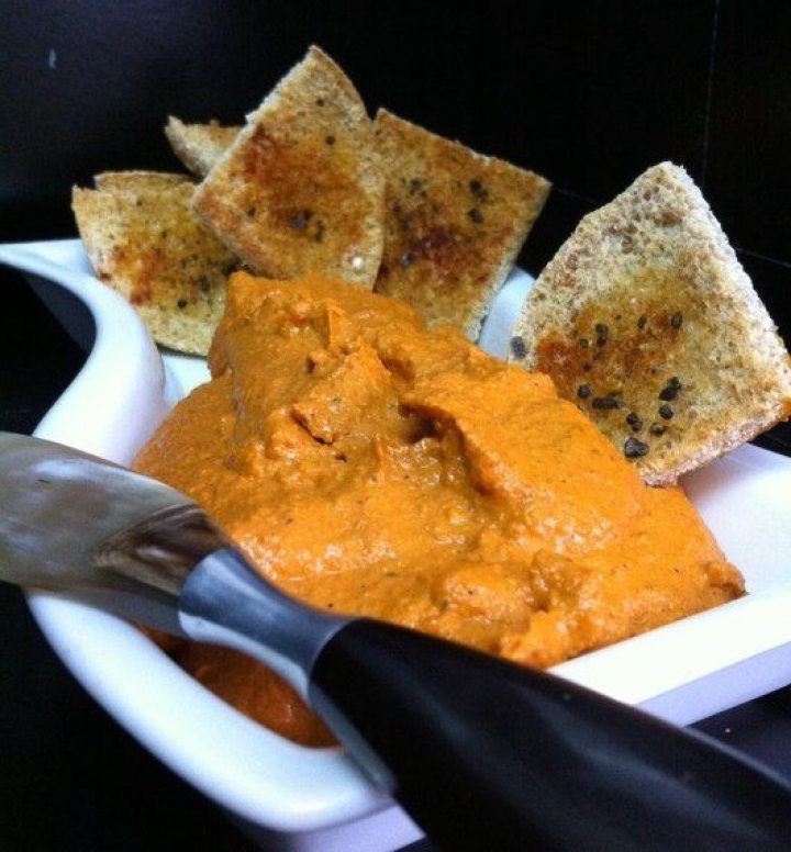 - Para acompañar, corta el pan de pita en triángulos. Pela el ajo restante y restriégalo en algunos de los triangulitos; en otros, espolvorea pimentón o la especie que te guste. Ponles un poco de sal y aceite y mételos al horno para que se doren un poquito.