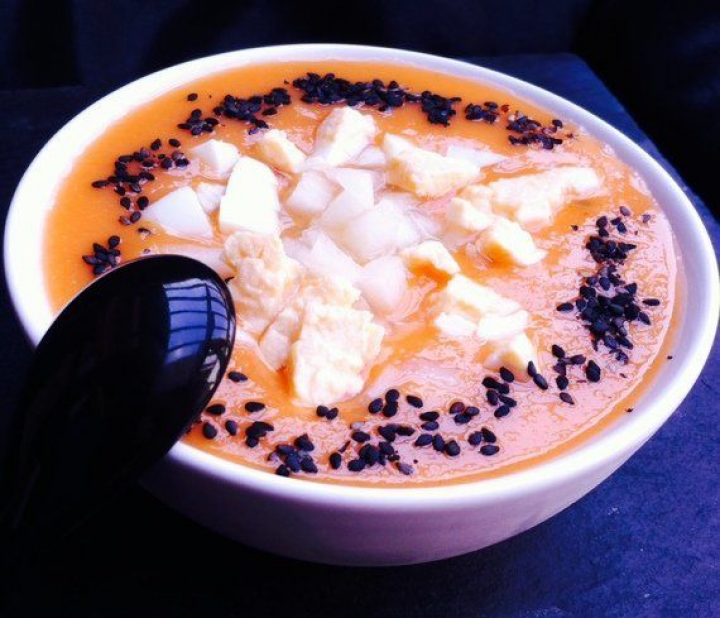 - Emplatado: en un bol vierte el gazpacho y añade por encima los trocitos de melón y huevo. Decora con las semillas de sésamo.